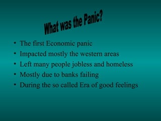 It was the first economic depression experienced by the American public who panicked as they saw the prices of agricultural products fall and businesses fail. The American banking system was very unstable in the early days of the Republic. The overproduction of staples such as wheat and cotton.